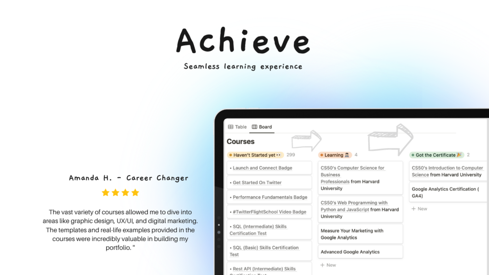 Notion Ultimate Course Collection stands out from other online learning platforms due to its extensive selection of 3000+ courses from top institutions and industry experts. With the ability to earn badges and certifications upon completion, users gain valuable credentials to enhance their professional profiles. The template's customizable learning paths cater to individual goals, allowing users to track progress and leverage Notion's robust productivity tools. Additionally, regular updates ensure access to the latest industry knowledge, making Notion Ultimate Course Collection a superior choice for learners seeking a comprehensive and personalized learning experience.