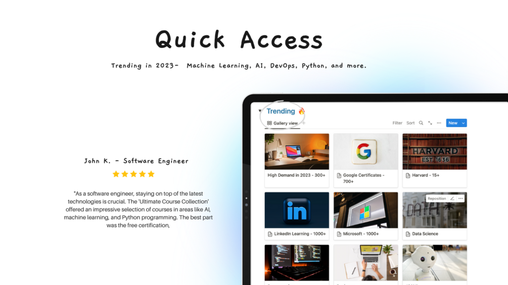 Whether you're looking to improve your coding skills, learn about the latest industry trends, or explore new technologies ( Ai, Machine Learning, Digital Marketing..), our Ultimate Course Collection Notion template has got you covered.