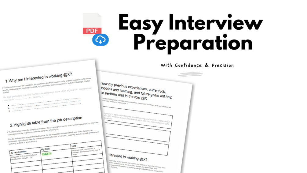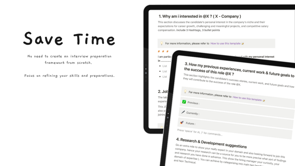 - Save Precious Time βοΈ: By providing a pre-designed template, it saves you time and effort in creating an interview preparation framework from scratch, allowing you to focus on refining your skills and preparing effectively.